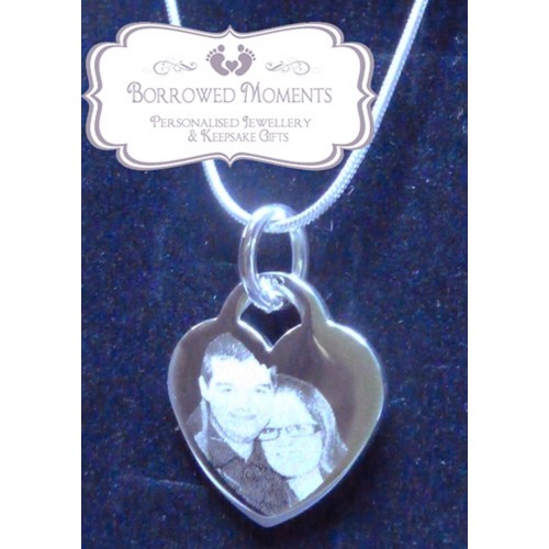 This is a 925 Sterling Silver Wedding Photo Engraved Necklace, featuring your wedding photo on one side and your names, the date or short message on the reverse. The heart charm is attached to a FREE sterling silver, fine curb chain and is a perfect personalised gift to capture a precious wedding moment and your finished necklace will come presented in a FREE luxury gift box, so perfect as a gift for someone else or just a precious wedding keepsake for yourself.