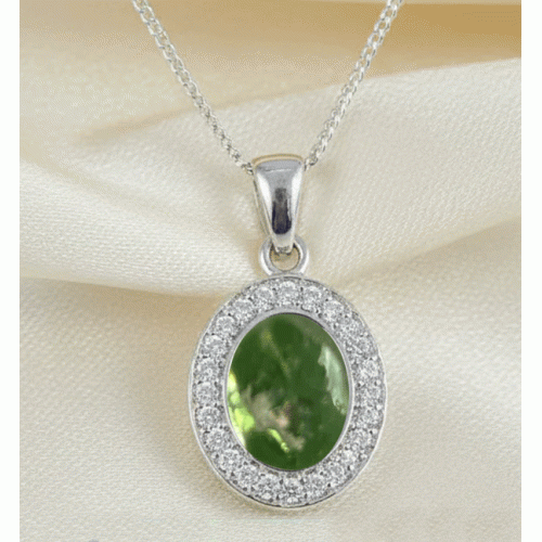 Carry their memory close to you always. Our Luxury, Ashes in Glass Cubic zirconia Necklace is a timeless keepsake that gently holds the cremation ashes of your lost loved one within a real real glass pendant, surrounded by dlicate cubic zirconia stones.